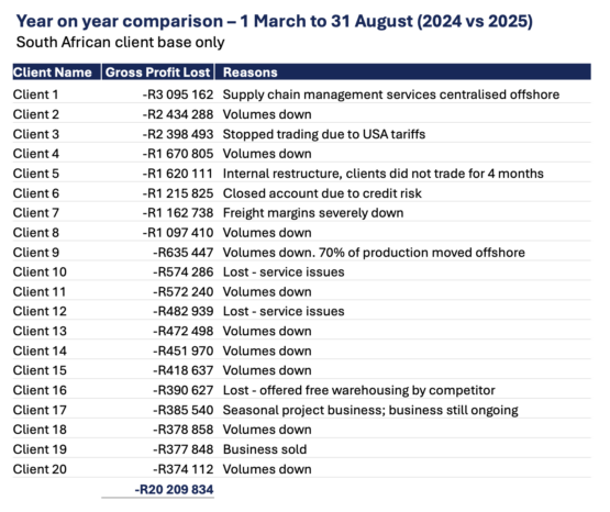 At one of its clients, R2.4 million of revenue disappeared between this year and last year due to the business ceasing trading “due to US tariffs”.